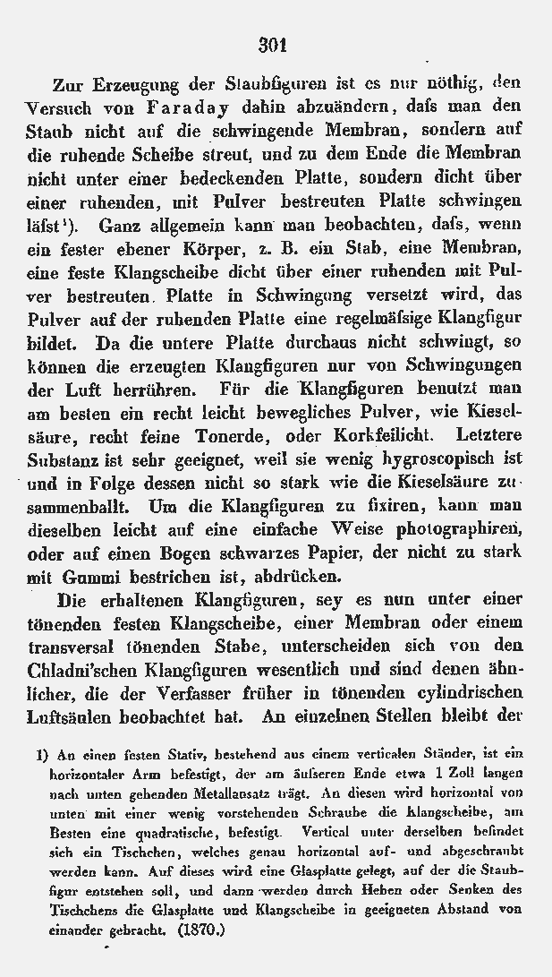 | 1832 | Faraday | Ueber eine eigenthümliche Klasse akustischer Figuren, und über gewisse Formen, welche Gruppen von Theilchen auf schwingenden elastischen Flächen annehmen